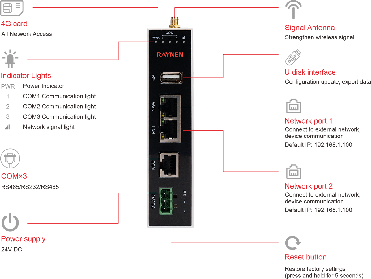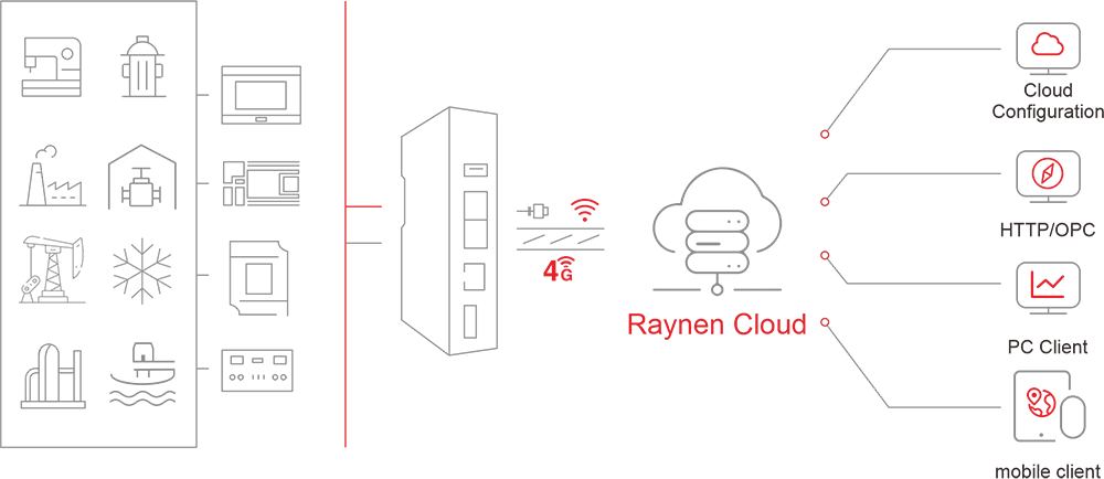Raynen Cloud está hospedado em servidores Alibaba Cloud, que recebem dados de UBoxes em instalações industriais. Os dados no local são coletados no servidor e o armazenamento e a transmissão dos dados são realizados, proporcionando interação de dados entre os dados no local e os clientes remotos.