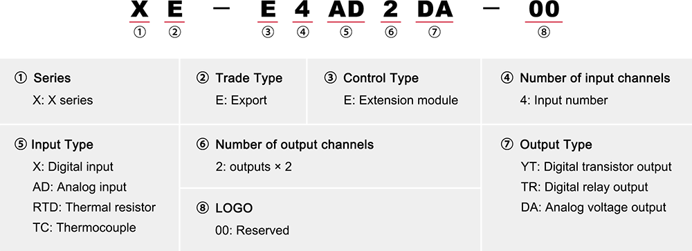 | 4 | X-E4DA-01 | Módulo de expansão de saída analógica universal da série X, 4AO, saída de tensão de 16 bits/saída de corrente de 15 bits |